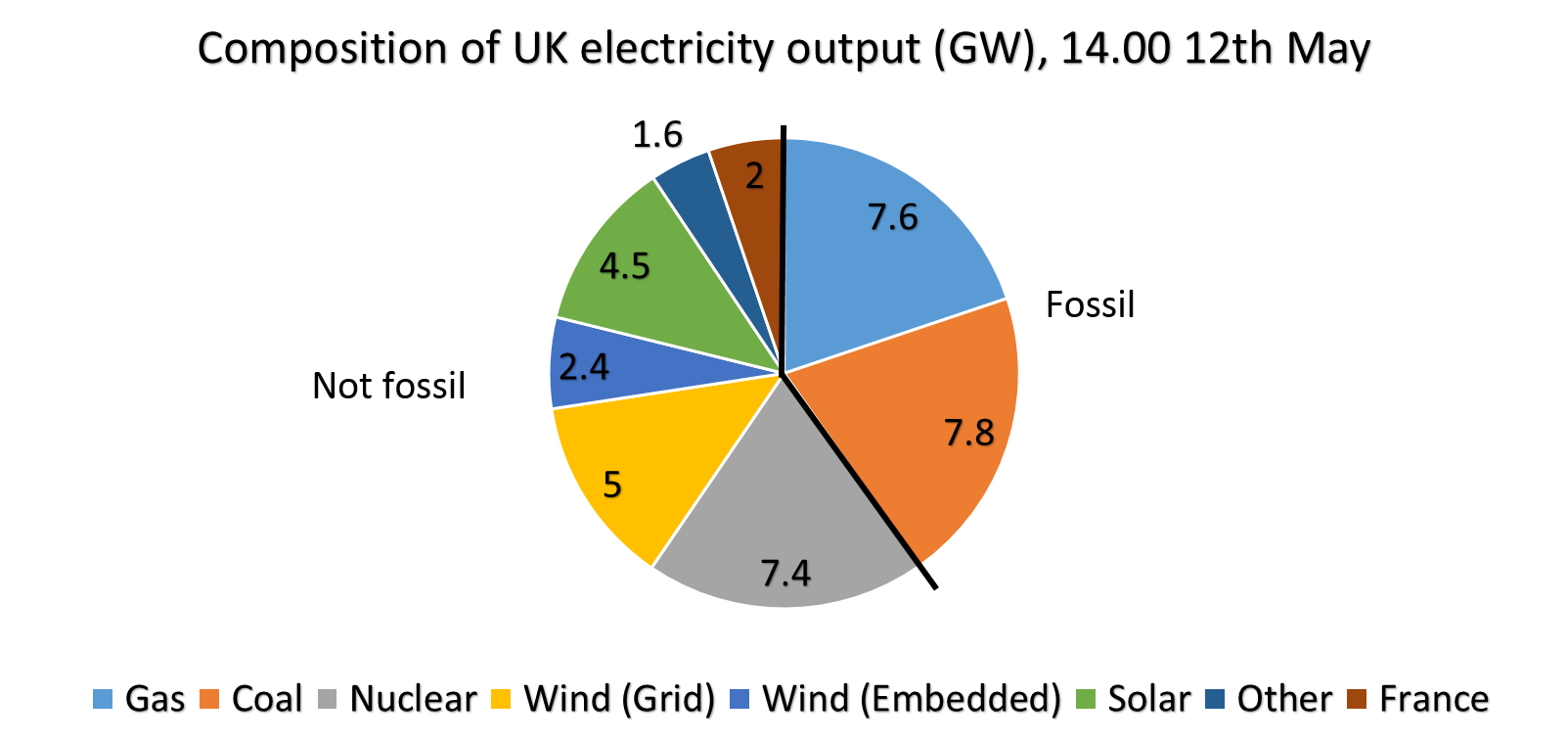Nuclear gives us 7.3 GW and the France interconnector about 2.0 GW. Assume that this power is all fossil free and 60% of UK electricity – for a few hours until the wind and sun fade – is low-carbon.